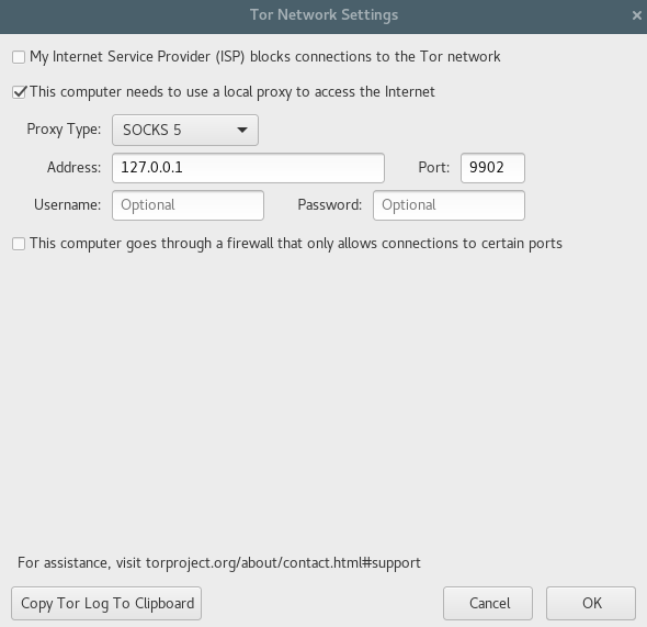 --proxy-server="socks5://127.0.0.1:9901"with-proxy-server="http://127.0.0.1:8801" - Torbrowser:
