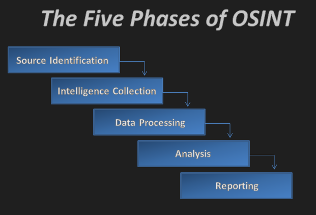 There are usually considered to be five phases for conducting a successful OSINT investigation. Take a look at this flow chart for a quick understanding of what the hell I'm talking about.